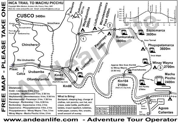 ALTERNATIVE TREKS 2009: SEE MORE DETAILS AND CHECK CONFIRMED DEPARTURES GROUPS, AT THE LINKS BELOW: LARES TREK, 4 DAYS/ 3 NIGHTS: http://www.andeanlife.com/lares_valley_to_machu_picchu_4_day_trek.htm SALKANTAY TREK, 5 DAYS/4 NIGHTS: http://www.andeanlife.com/salkantay_to_machu_picchu_5d.htm CHOQUEQUIRAO TREK, 4 DAYS/3 NIGHTS: http://andeanlife.com/choquequirao_4_day_private_trek.htm |